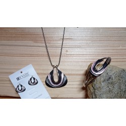 Sada ve stříbrném pokovu. Náušnice jsou na puzetku, náhrdelník je na řetízku v délce cca 45 cm a prodlužka 7 cm, náramek je na gumičce. Sada je vyrobená z bižuterního kovu a barevná část je smaltovaná. Povrch pokovu  splňuje současné trendy a má protialergickou úpravu a je lehký .  Vše jde zakoupit i samostatně v příslušných sekcích.