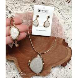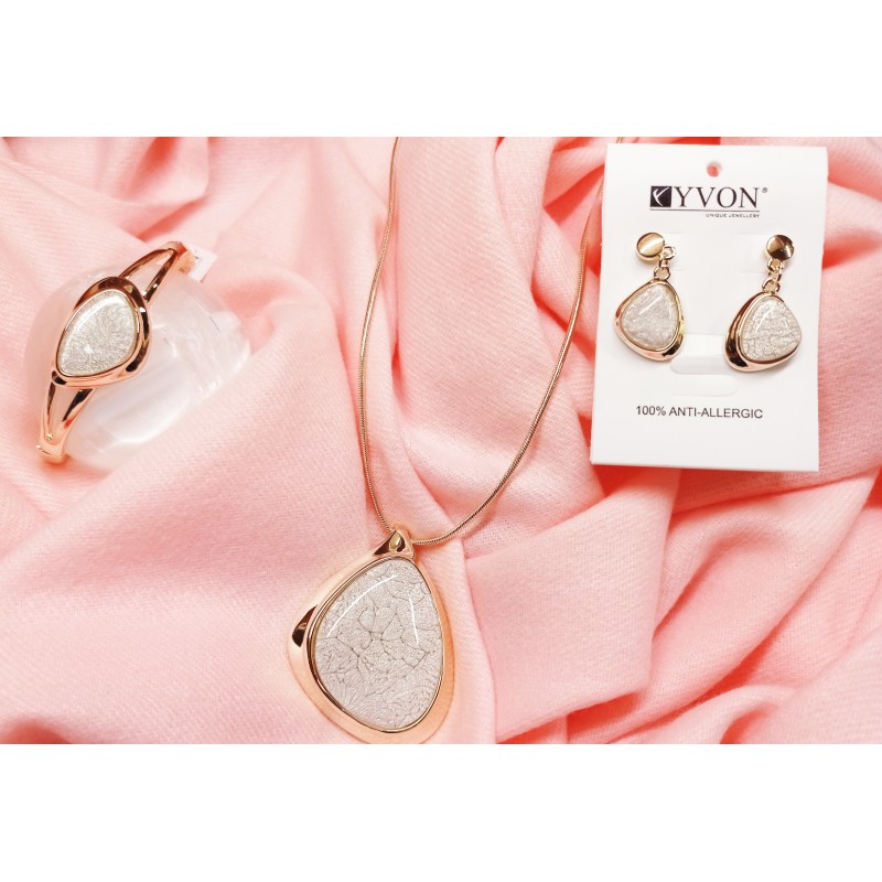 Souprava  firmy YVON s protialergickým zlatým pokovem . Hlavní část tvoří  leštěná pryskyřice jemně bílá. Náušnice jsou na dřík , ze zadu na puzetu. Jsou velice efektní pro svůj nezvyklý tvar. Lehké. Náhrdelník je v délce 45 cm + 7 cm prodlužka, lehký .Zajímavý tvar a uchycení pryskyřicové části jemně bílé barvy. Náramek je na gumičku. Lze zakoupit v příslušných sekcích samostatně.
