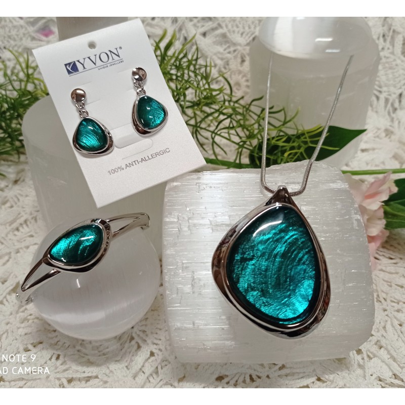 Souprava firmy YVON s protialergickým stříbrným pokovem . Hlavní část tvoří leštěná pryskyřice . Náušnice jsou na dřík , ze zadu na puzetu. Jsou velice efektní pro svůj nezvyklý tvar. Lehké. Náhrdelník je v délce 45 cm + 7 cm prodlužka, lehký .Zajímavý tvar a uchycení pryskyřicové části . Náramek je na gumičku. Lze zakoupit v příslušných sekcích samostatně.