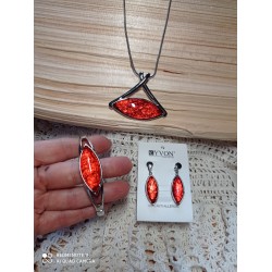 Nádherná sada šperků z protialergickou povrchovou úpravou bižuterního kovu. Lze objednat i samostatně. Náramek je na gumičce a náhrdelník je v délce 45 cm plus 5 cm prodlužka. Náušnice jsou na dřík a mají ze zadní strany  plastovou čepičkuv, náušnice jsou v celkové délce 4cm. Sada má tři varianty ve stříbrném pokovu a to barvu pudrovou, smaragdovou a červnou. Luxusní koustky . Náramek 350, Náhrdelník 350, náušnice 250 korun.