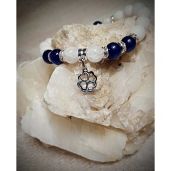 Minerální náramek je z jadeitu a praskaného křišťálu, Přívěsek čtyřlístek je z chirurgické oceli.Ostatní kovové komponenty jsou z bižuterního kovu. Náramek