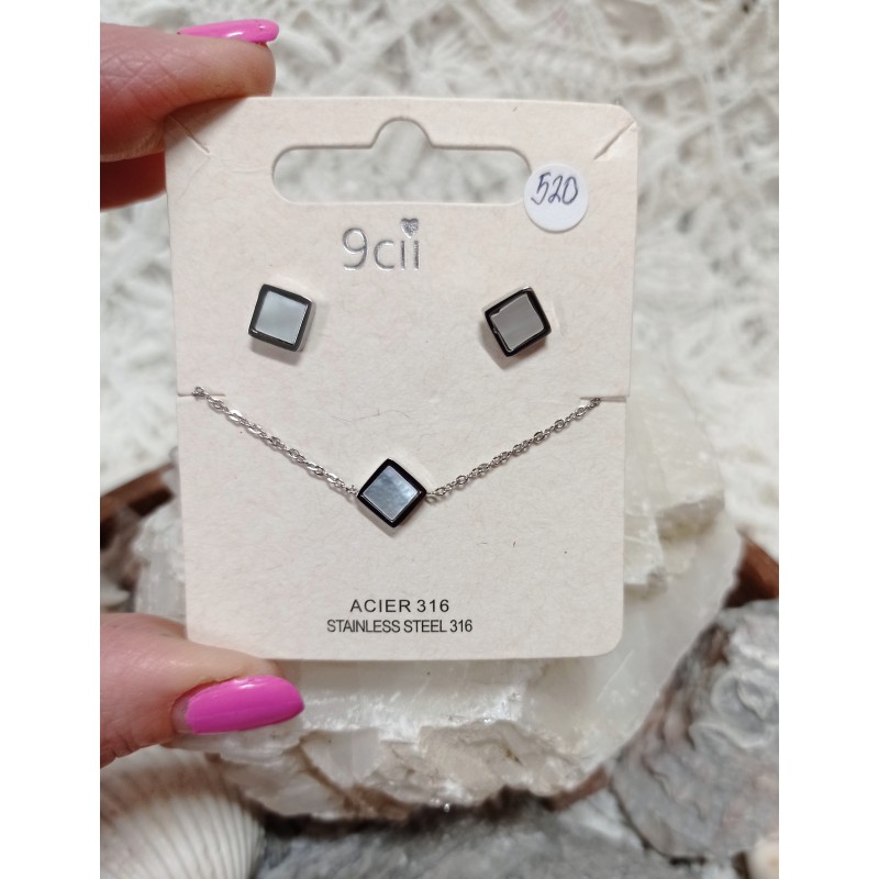 Náušnice ve tvaru čtverce s perletí a kovovým okrajem na puzetku s kovovým motýlkem. Řetízek dlouhý 42 cm +prodlužující řetízek. Velice decentní a nadčasové . Vše Stainless Steel.