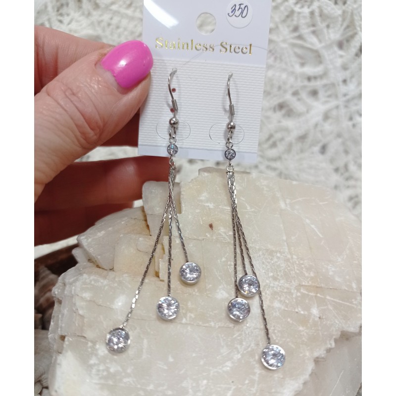 Náušnice řetízkové trojté, zapínání afroháček zajištěný gumovou zarážkou.  Délka včetně afroháčku 9cm. Na kanco řetízku kamínky průměr 0,5cm. Steinnles Stell.
