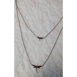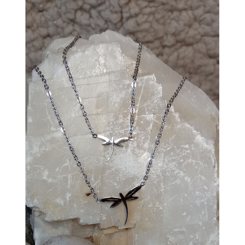 Řetízek z chirurgické nerez oceli. Jedná se vlastně o dva řetízky v sobě, delší má 50 cm, kratší má 40 cm. Větší vážka 2 cm, menší 1,2 cm.