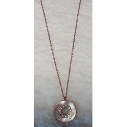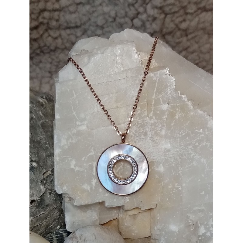 Řetízek z chirurgické nerez oceli v barvě růžového zlato. V středové části kruhu jsou drobné kamínky. Kroužek je vykládán perletí . Délka řetízku je zakončena prodlužkou v délce 5 cm, kterou můžete regulovat délku.